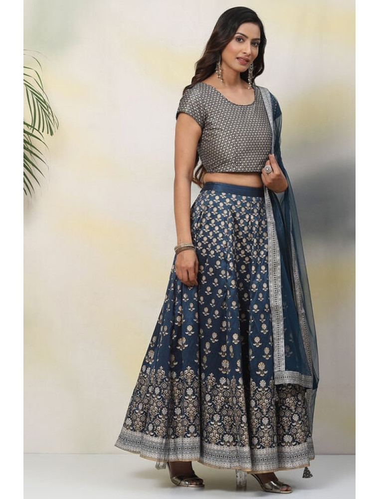 Adorn yourself in art silk opulence. The embroidered blouse and polyester Lehenga offer a luxurious appeal. Elevate your ensemble with oxidized earrings and Mojaris, creating a harmonious fusion of traditional artistry and modern accessories.