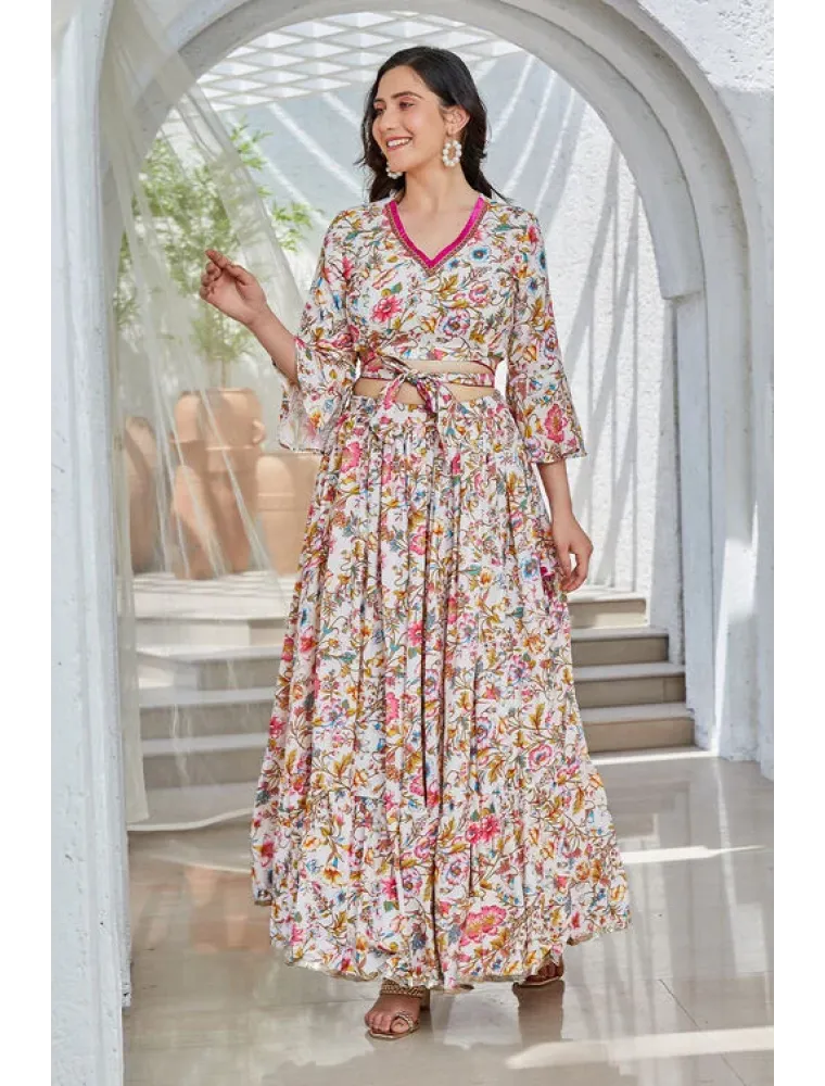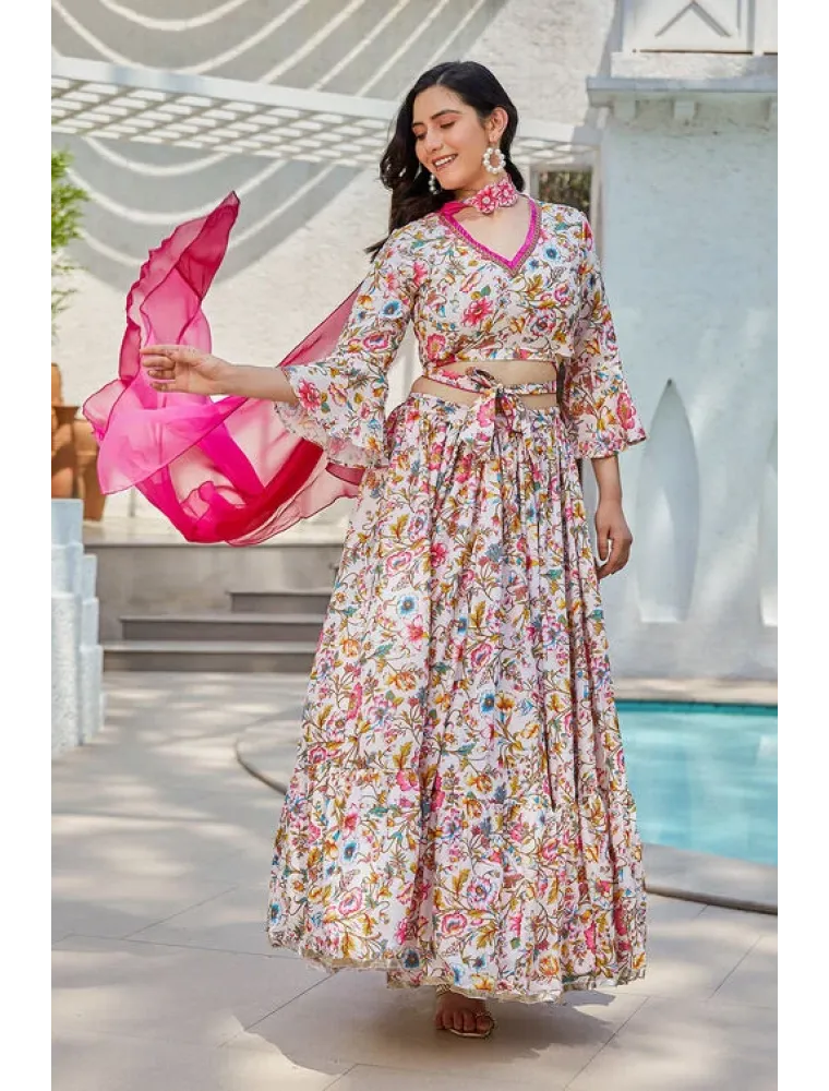 Stay cool this summer with our exquisite off-white and pink floral printed Lehenga set, crafted with meticulous attention to detail. Ideal for daytime wedding celebrations offering both elegance and comfort in abundance.