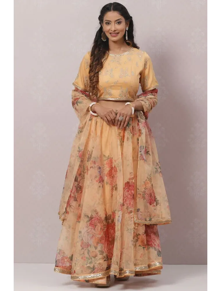 This vibrant mango yellow floral lehenga set is the perfect outfit for a summer wedding. It is made from a blend of polyester and cotton. The set features a round neckline and elbow length sleeves. Complete the look with the flared floral skirt and matching dupatta.