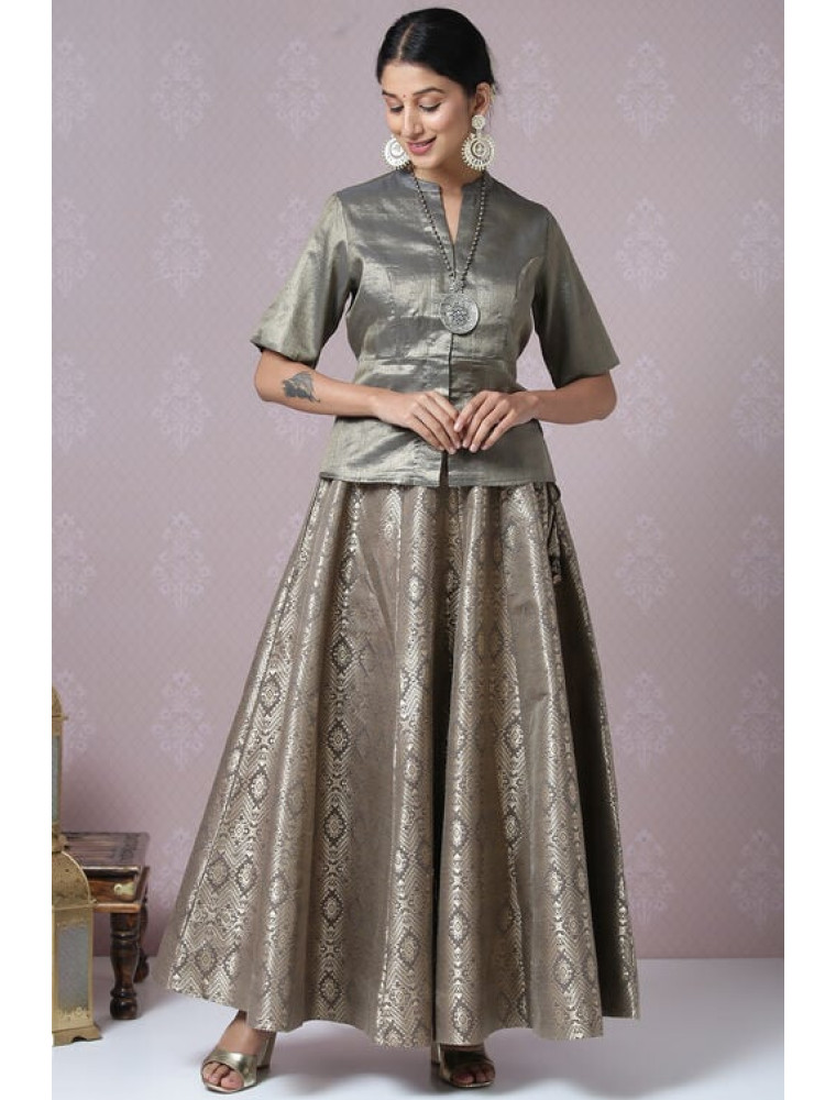 A brown brocade lehenga set from Biba festive collection. It is a two piece set combining three forth sleeves smart blouse and brocade lehenga bottom. Designed to match your contemporary taste, this lehenga is a must-buy.