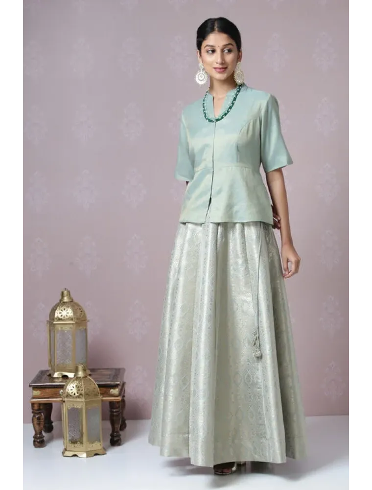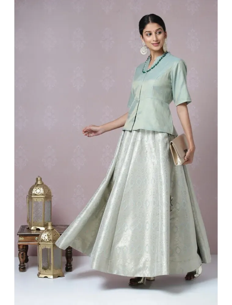 A brown brocade lehenga set from Biba festive collection. It is a two piece set combining three forth sleeves smart blouse and brocade lehenga bottom. Designed to match your contemporary taste, this lehenga is a must-buy.