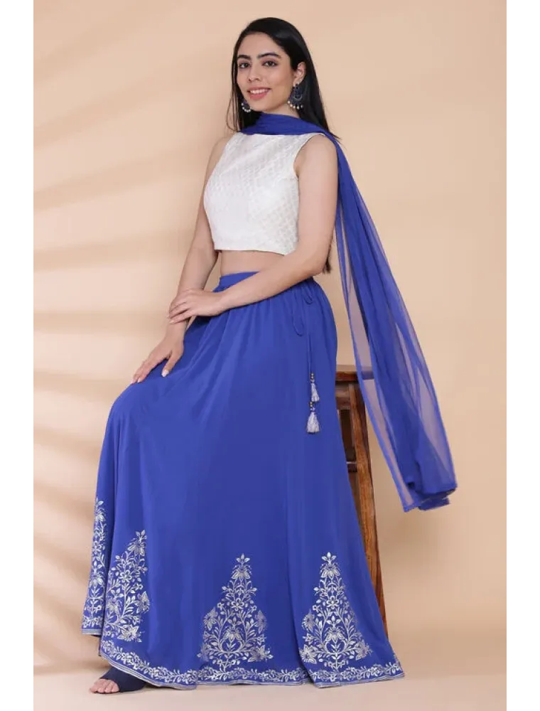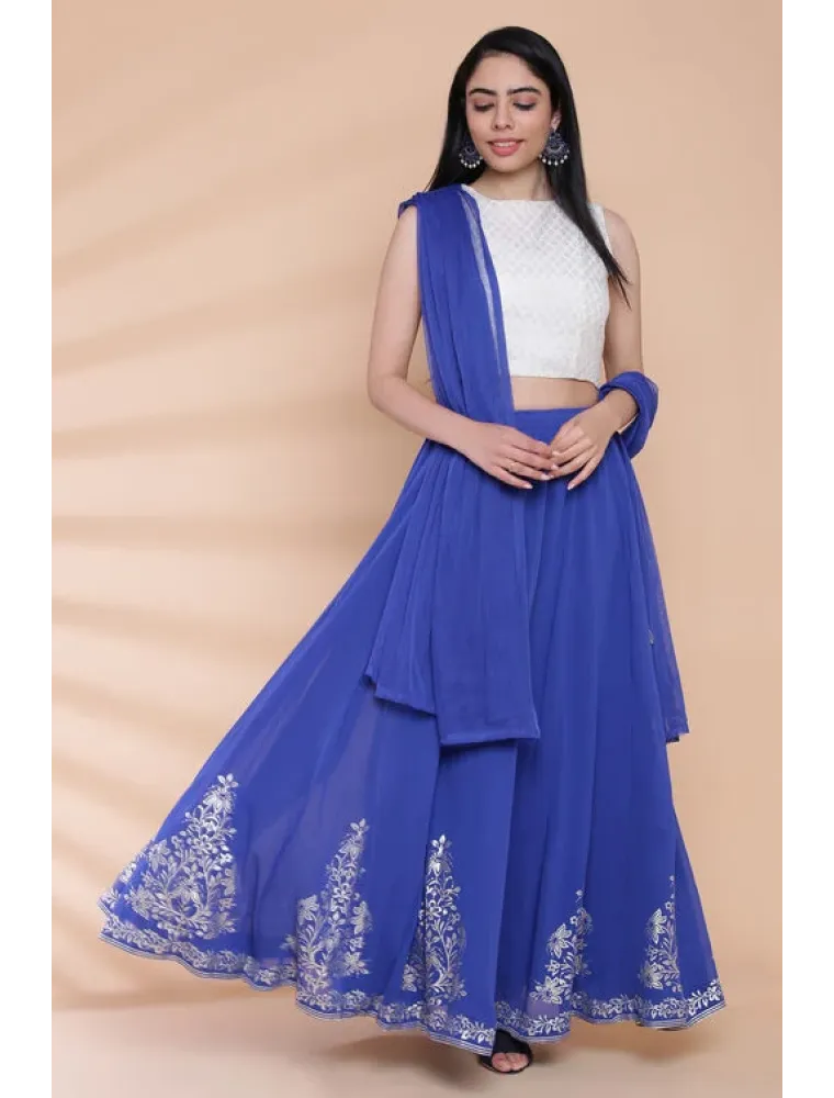 Give your traditional wardrobe a contemporary update with this white and blue lehenga set by Biba. The set includes a brocade cropped top, layered lehenga bottom and dupatta. Lehenga