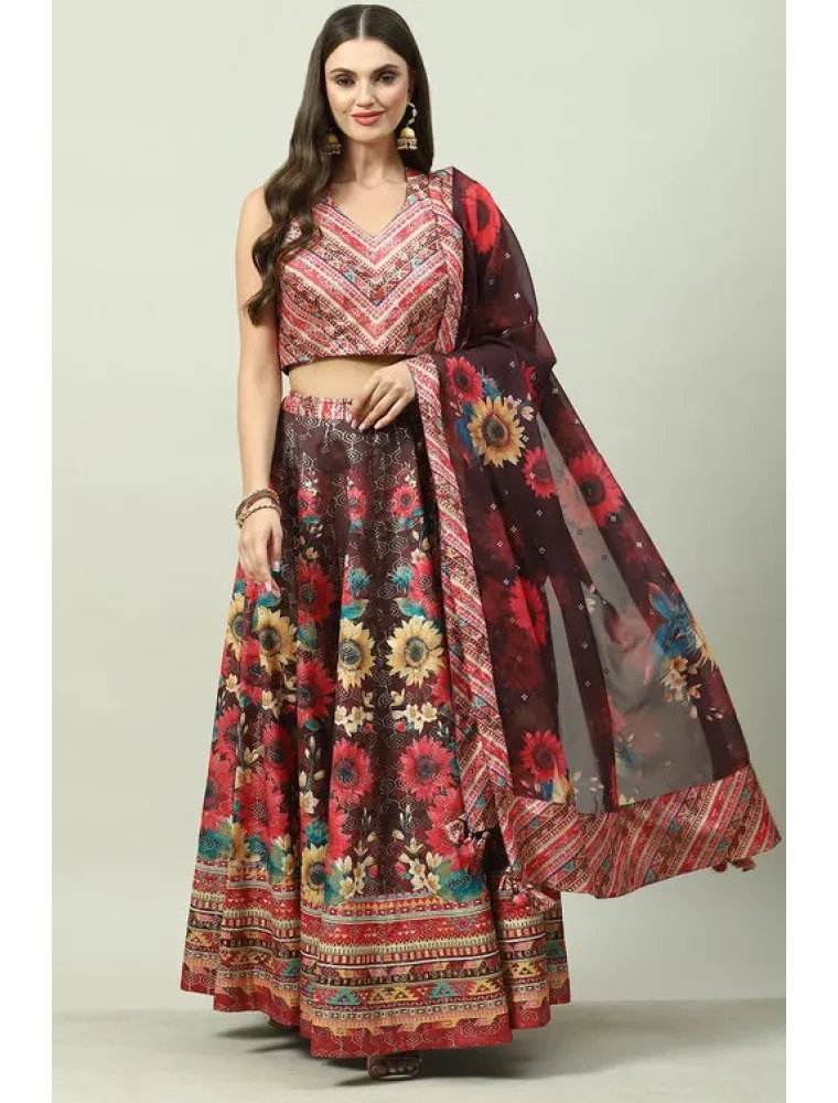 With wedding season around the corner, this chocolate brown lehenga set comes handy. Crafted from art silk, it includes a crop top featuring a stylish back, matching flared skirt and dupatta.