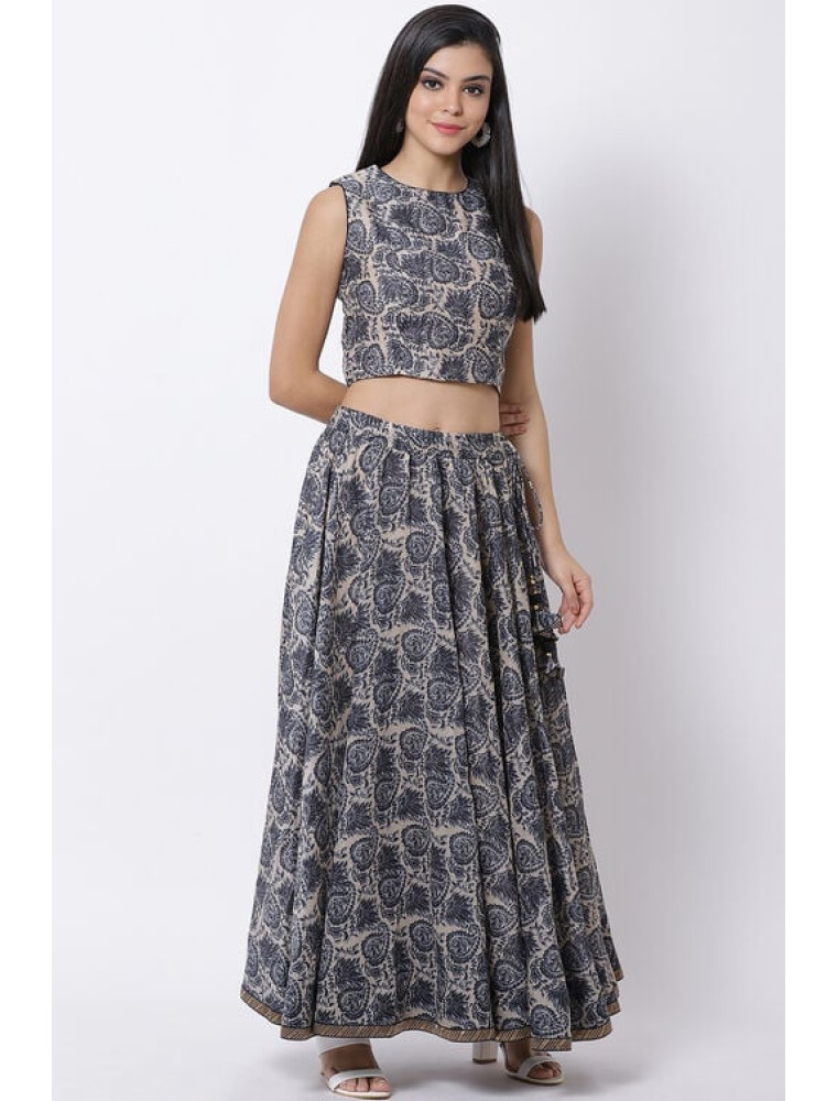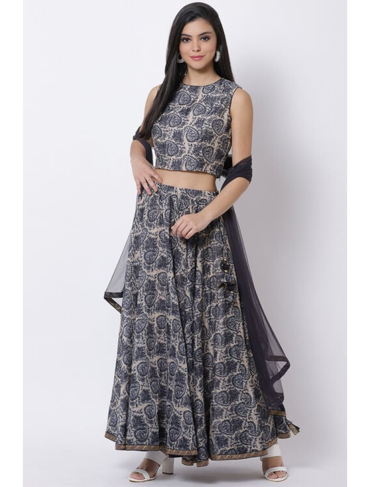 A fashionable lehenga set from our latest collection. The set includes a printed crop top and lehenga style with solid gota patti dupatta. Lehenga and top both features contemporary paisley print all over, top has a side zipper and lehenga comes with elasticated waist and tasseled drawstring.