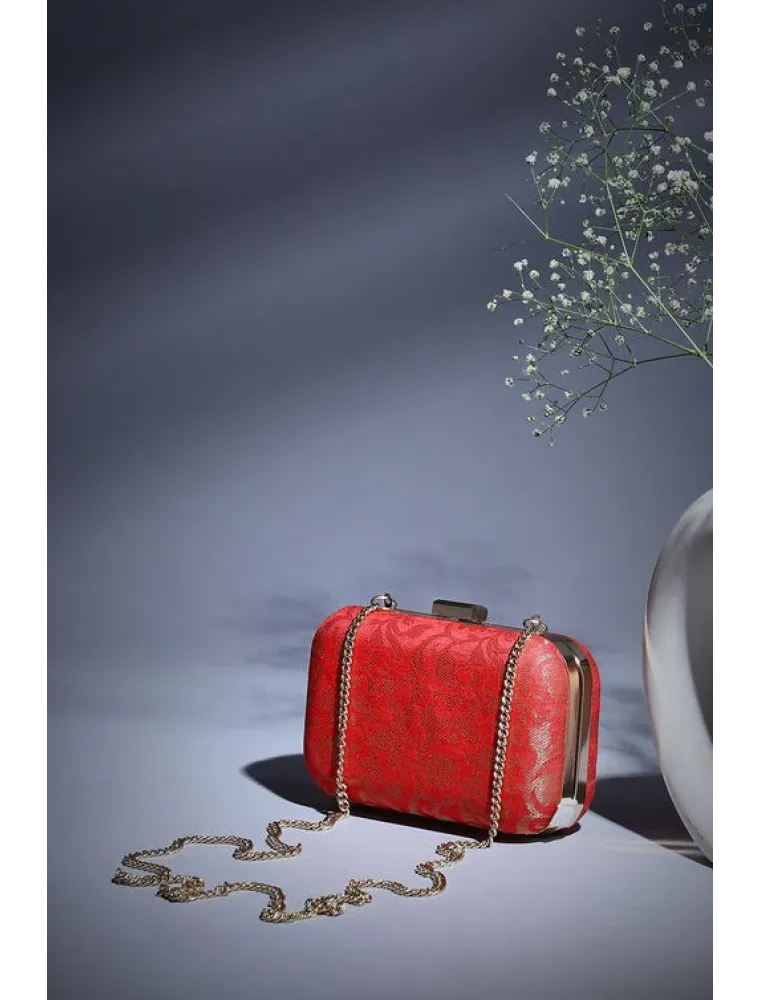 Add a statement accessory to your ensemble with gorgeous clutch bags from Biba. Minimalistic, compact and stylish, this red silk clutch amps every woman's aura. It comes with a gold chain, style it with an anarkali suit set or saree!