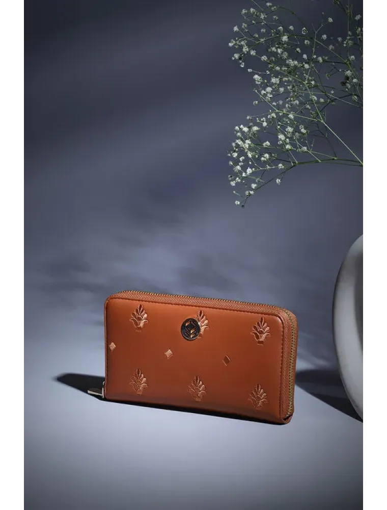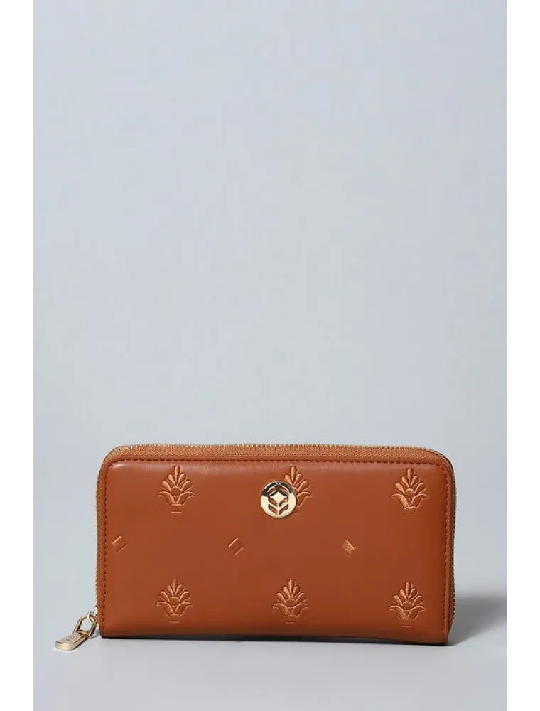 A sleek wallet is your everyday companion no matter where you are headed to. This elegant tan wallet from our new handbags range is crafted from pu leather. It looks chic and features embroidery along with zip closure and spacious pockets to keep your valuables safe. The wallet measures 19 * 9.5 cms in size.