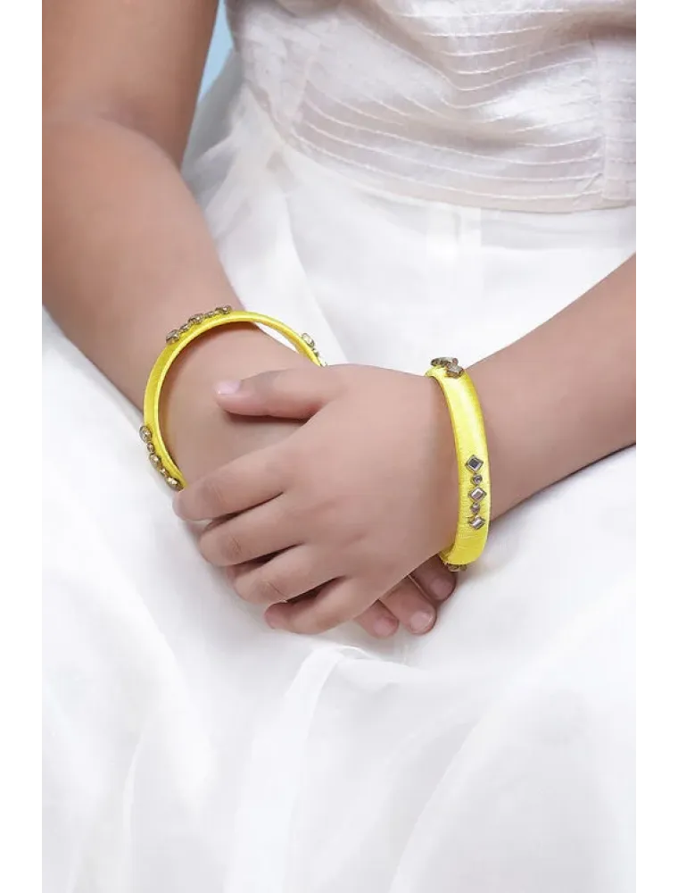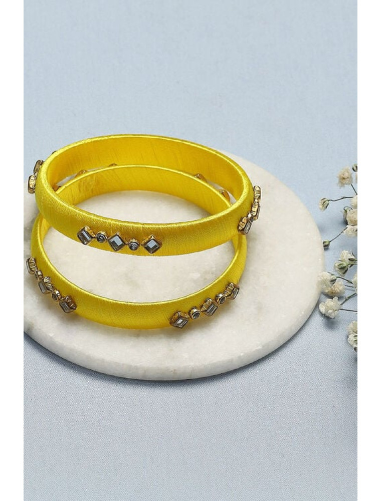 Illuminate your style with these vibrant yellow bangles, beautifully crafted from plastic and thread. Their sunny yellow hue brings a burst of cheerfulness, perfectly suited for festive occasions. The innovative blend of materials adds a contemporary twist to the traditional bangle, making them a standout addition to your ethnic wardrobe.