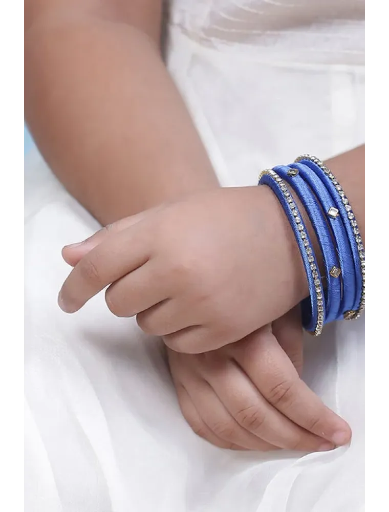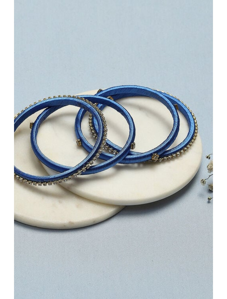 These royal blue bangles, crafted with a harmonious blend of plastic and thread, exude a sense of majesty and celebration. Their deep blue hue and intricate thread detailing make them an exquisite addition to any ethnic outfit, beautifully combining traditional artistry with a modern twist.