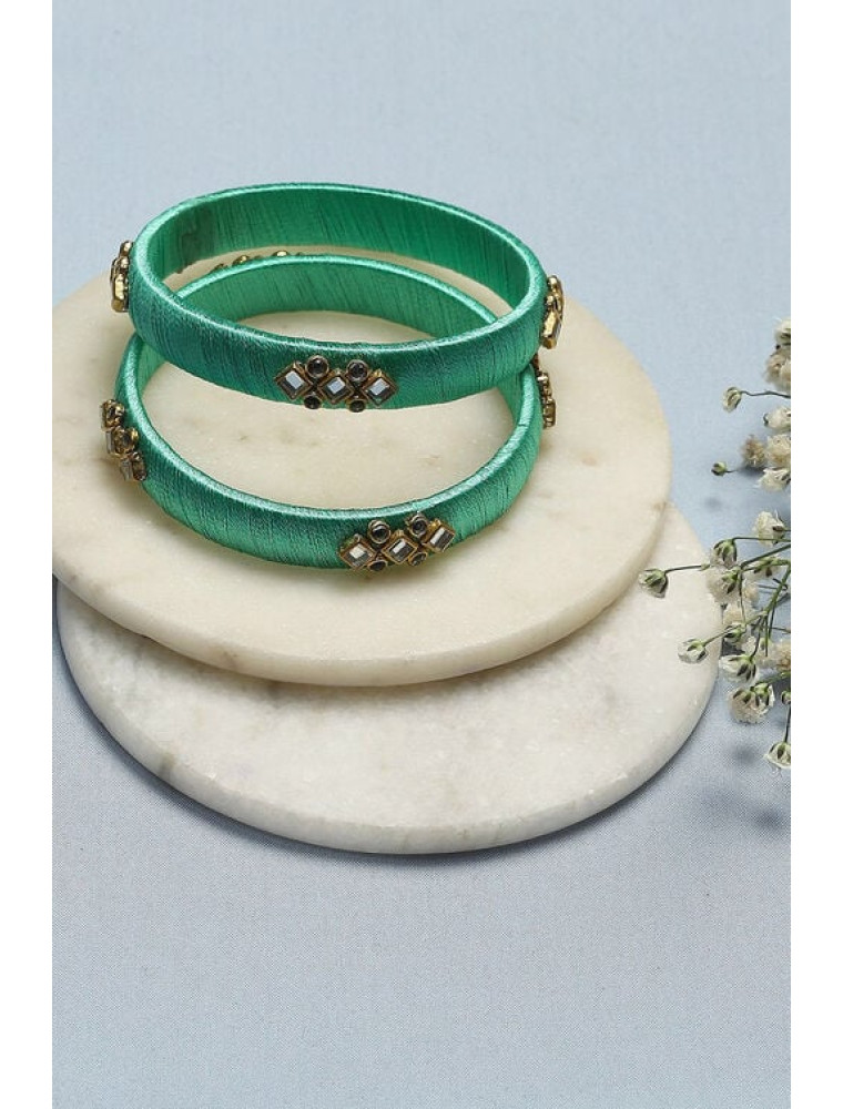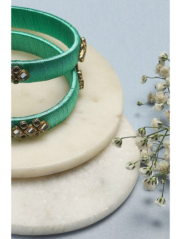 Step into a world of color with these exquisite turquoise bangles, a blend of plastic and thread craftsmanship. Their mesmerizing turquoise shade evokes a sense of joy and celebration, perfect for any festive occasion. These bangles merge the charm of ethnic style with a modern twist, offering an accessory that's both trendy and timeless.