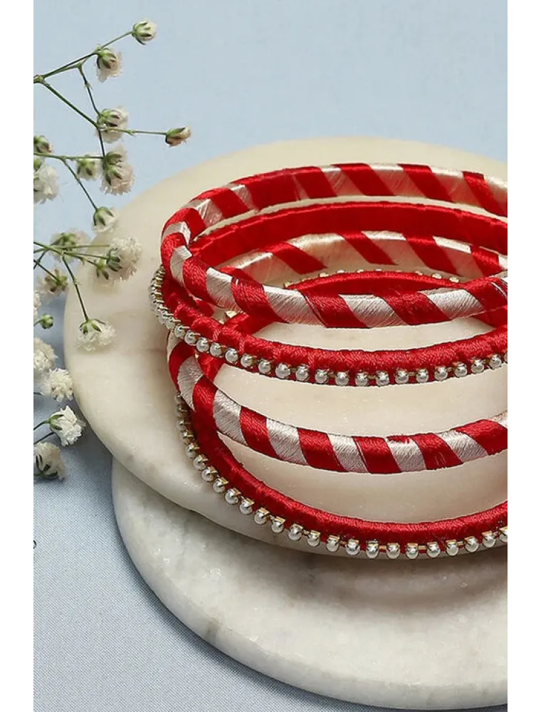 These captivating red and white bangles, exquisitely crafted from plastic and thread, embody the spirit of celebration. Their bold red combined with classic white creates a stunning visual contrast, ideal for any festive occasion. The blend of traditional design with modern materials makes these bangles a unique and stylish addition to your ethnic wardrobe.