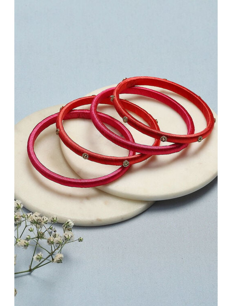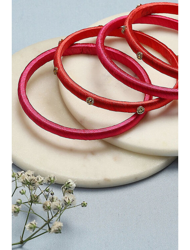 These festive bangles, crafted from a blend of pink plastic and thread, offer a delightful mix of durability and artisanal charm. The vibrant pink hue exudes a sense of joy and celebration, making them a perfect accessory for traditional festivities.