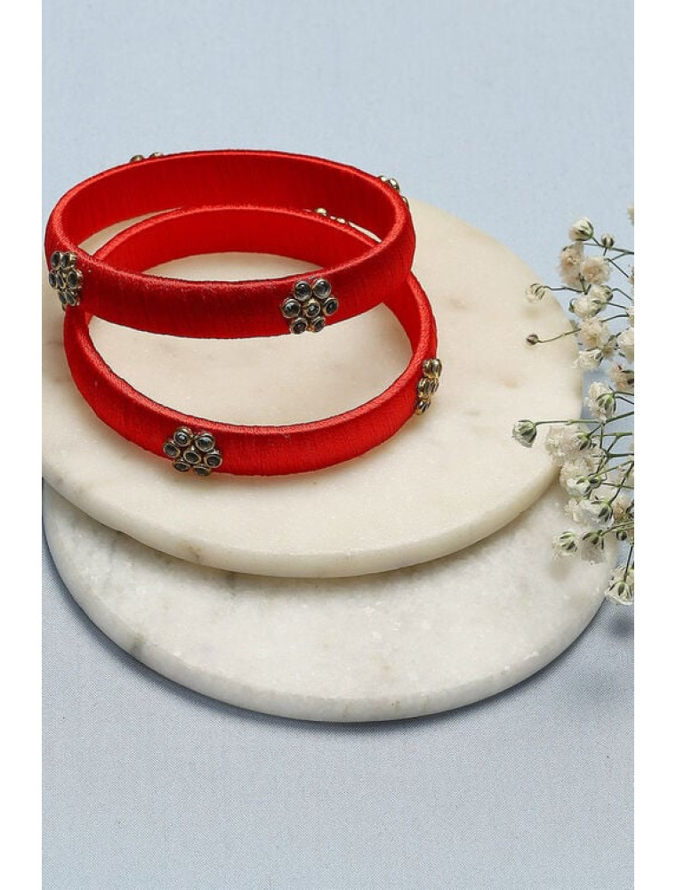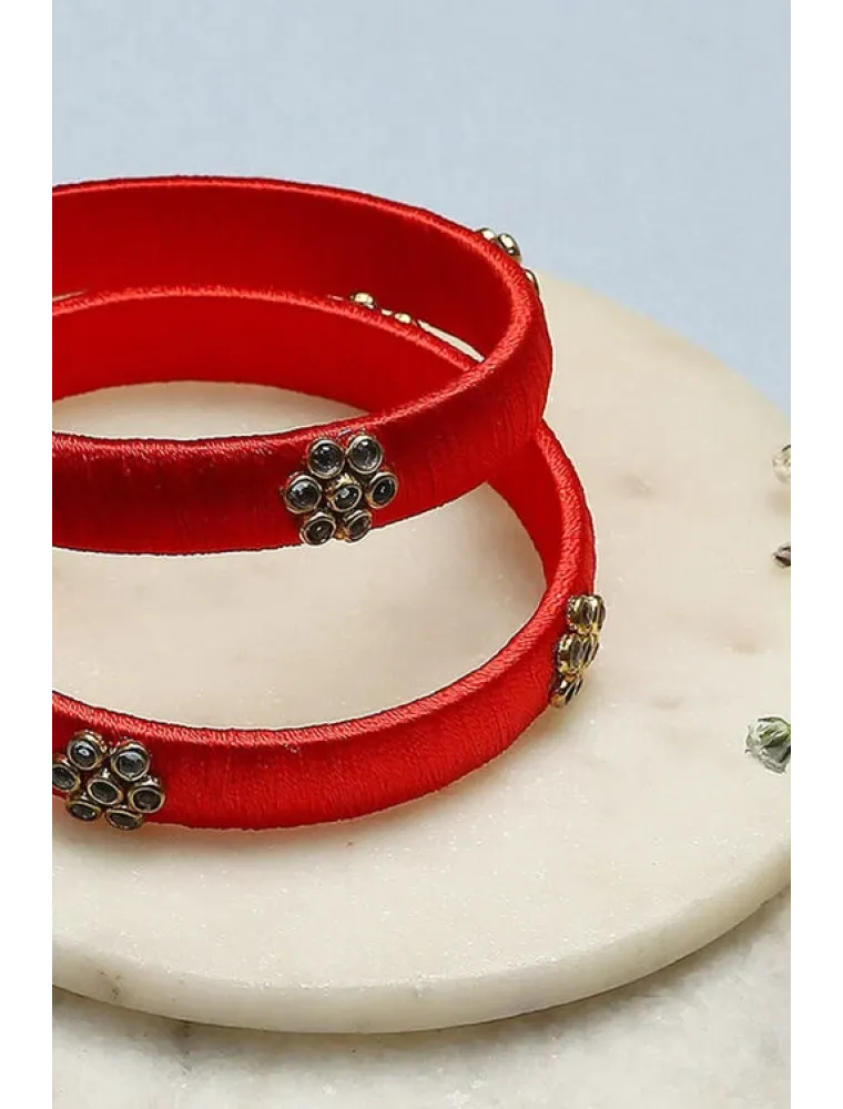 Celebrate in style with these exquisite red bangles, a seamless blend of plastic and thread craftsmanship. Their vibrant red hue is a symbol of joy and festivity, ideal for special celebrations. The unique material combination offers a contemporary twist to the traditional bangle design, making them a must-have for any ethnic attire.