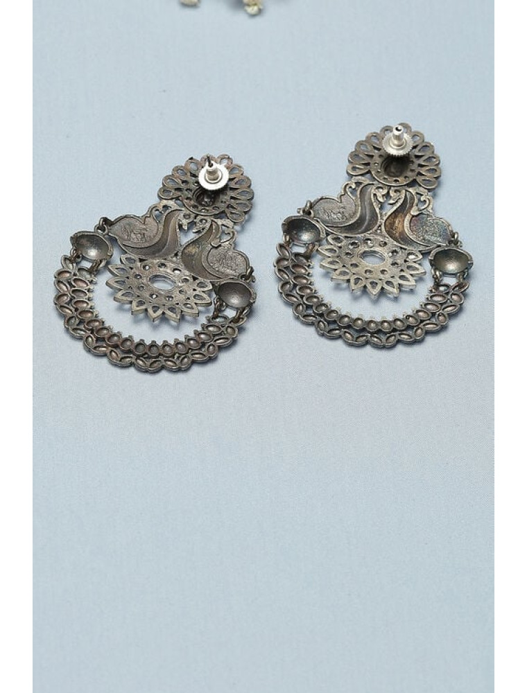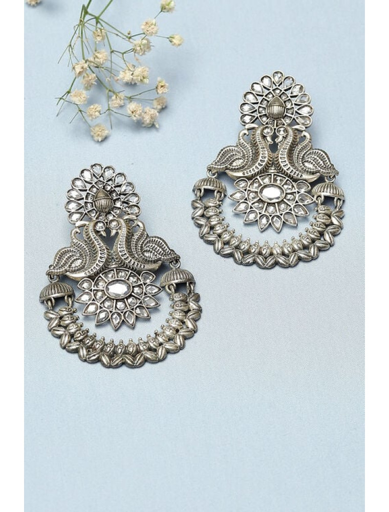 Explore exquisite pieces of handcrafted jewellery from Biba to embrace your aura. Inspired from a mix of modern and traditional designs, we strive to preserve the age old craft techniques. These silver oxidised chandbali earrings are made from alloy. They have white stones embedded along with a peacock motif design.