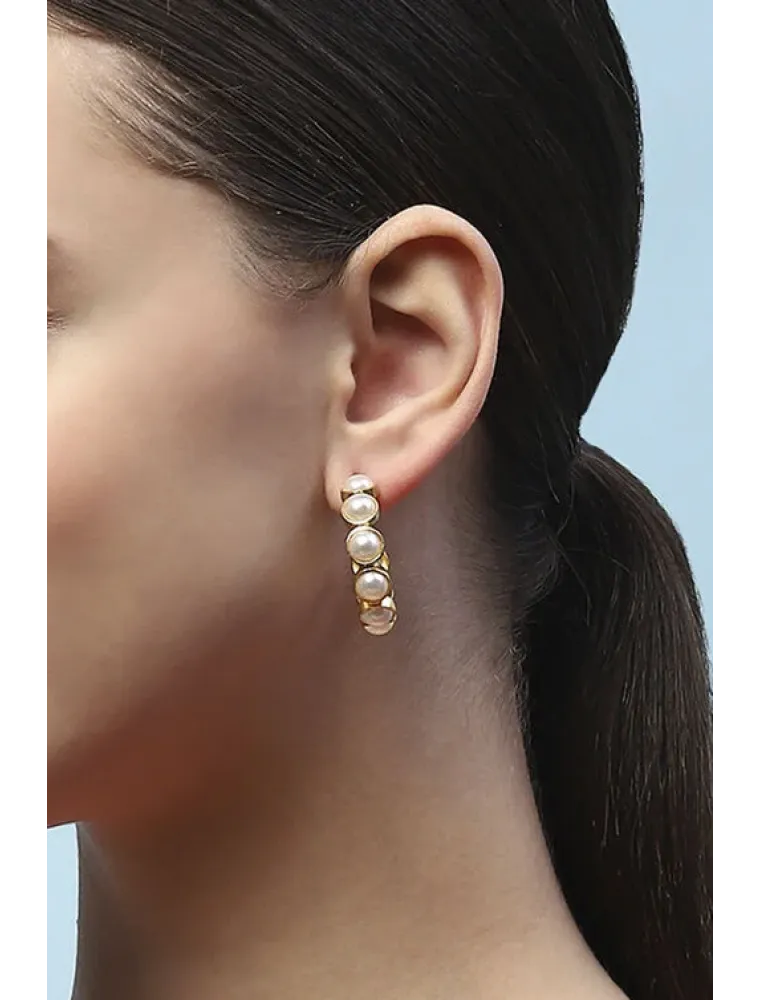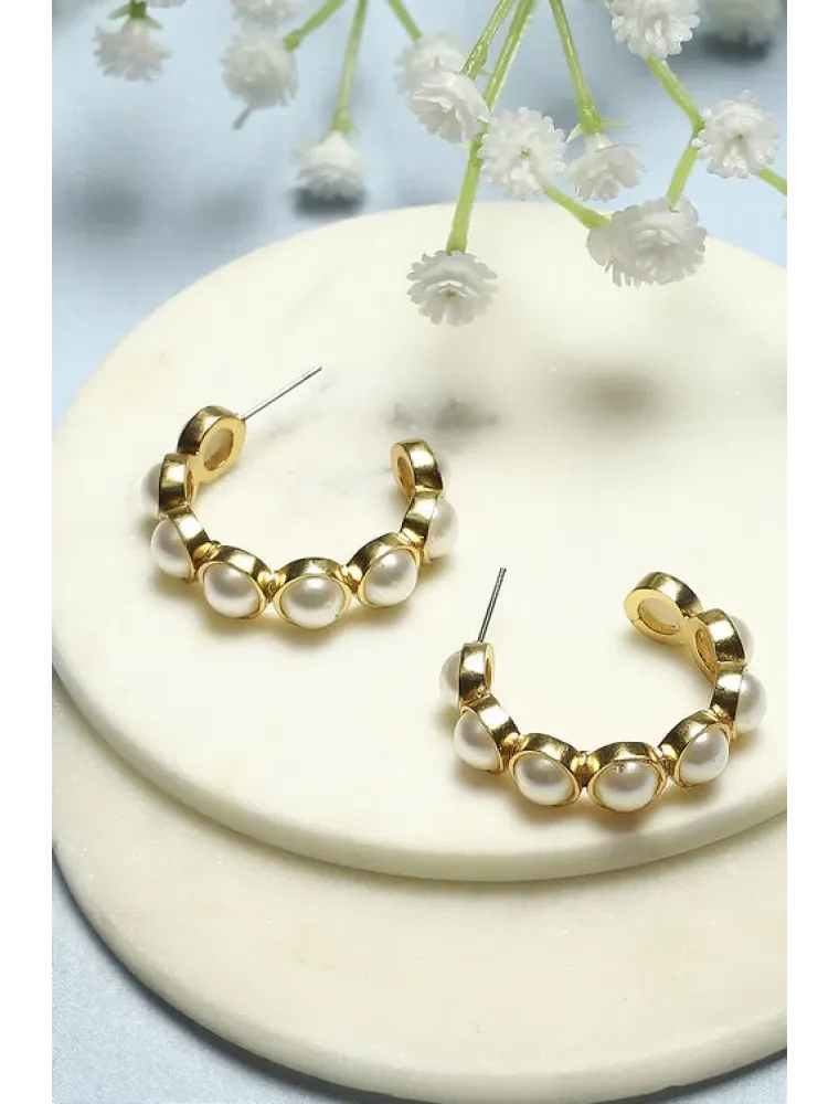 Introducing our dazzling gold-plated hoops, adorned with stunning pearls and crafted from high-quality brass. These eye-catching earrings are designed to turn heads and elevate any outfit. Part of our exclusive jewellery collection, they are a must-have accessory for every woman. Featuring a push-plug closure for easy wear, these versatile hoops effortlessly complement both ethnic and western attire, making them perfect for any occasion. Embrace elegance and sophistication with this chic addition to your jewellery collection.