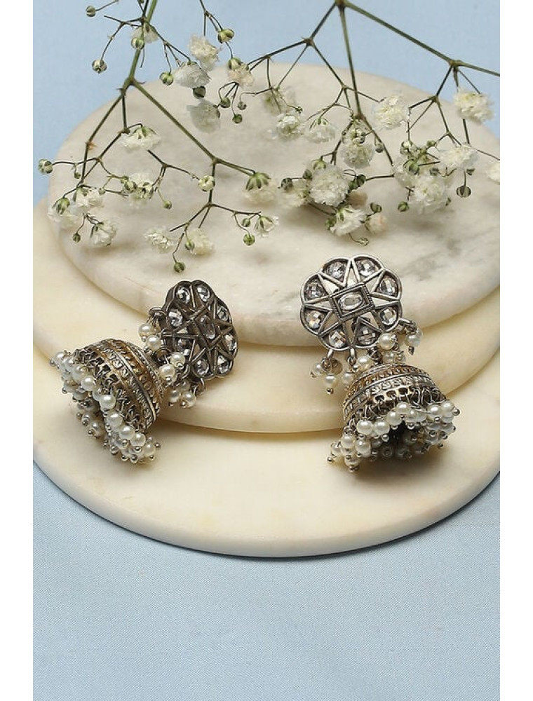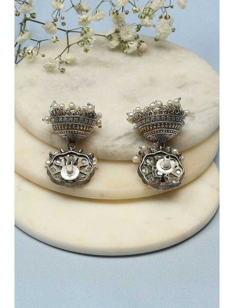 Embrace your inner confidence and captivate onlookers with these brass earrings that exude charm and uniqueness. The centerpiece boasts a captivating stone that adds a touch of intrigue to your ensemble. Accompanying the bold design is an asymmetrical half-circle plating adorned with exquisite beads, providing a harmonious balance of elegance and individuality.