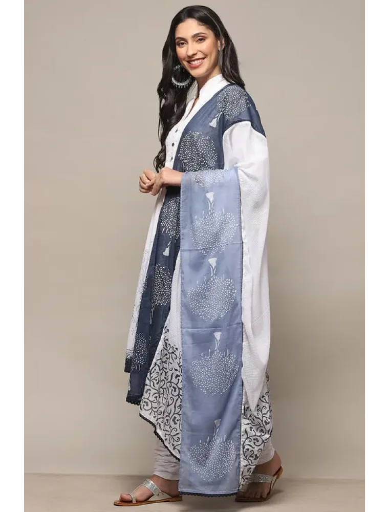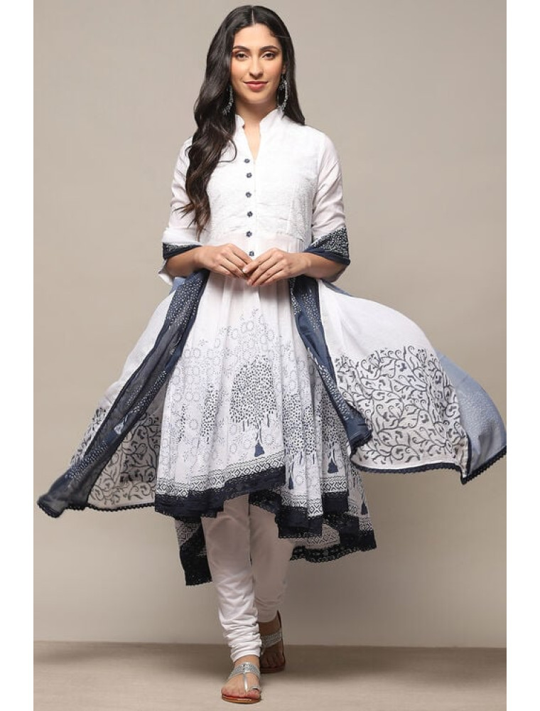 Embrace timeless elegance with a modern twist in our white-blue cotton asymmetric suit set, designed for the classic yet contemporary woman. Crafted from 100% cotton, this 3-piece ensemble includes a kurta, churidar, and dupatta, offering a blend of comfort and style. The kurta features a unique asymmetric cut, a stylish band collar, and solid color that contrasts beautifully with the blue accents, complemented by 3/4th sleeves for a sleek and refined silhouette. Ideal for sophisticated gatherings, office wear, or elegant daytime events, this outfit pairs seamlessly with minimalist jewelry and a blue or white clutch, emphasizing its clean lines and classic color combination for a truly chic ensemble.