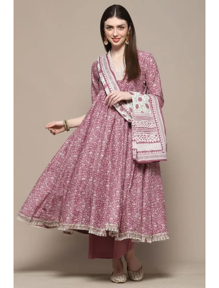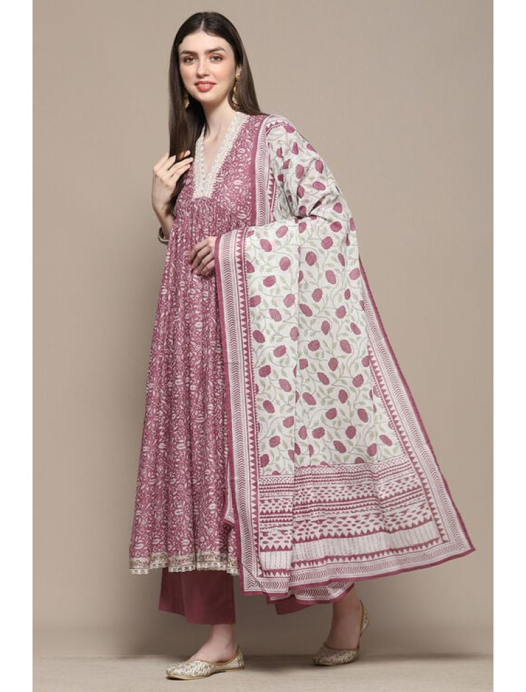 A harmonious blend of pink and white adorns the flowing cotton silhouette of the Anarkali suit set with a dupatta. A celebration of women's elegance and vibrancy. Perfect for summer outings.