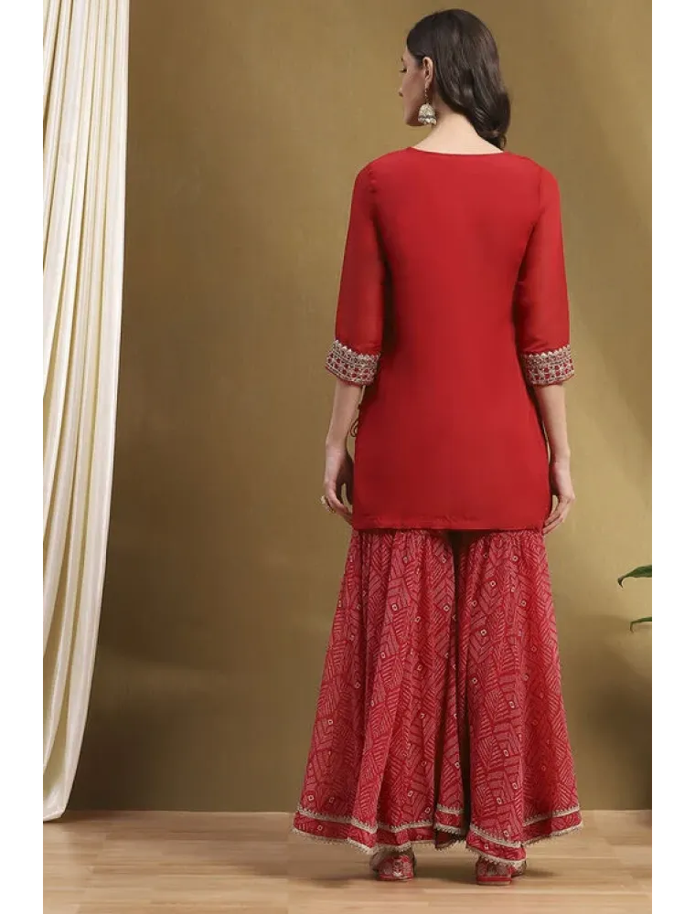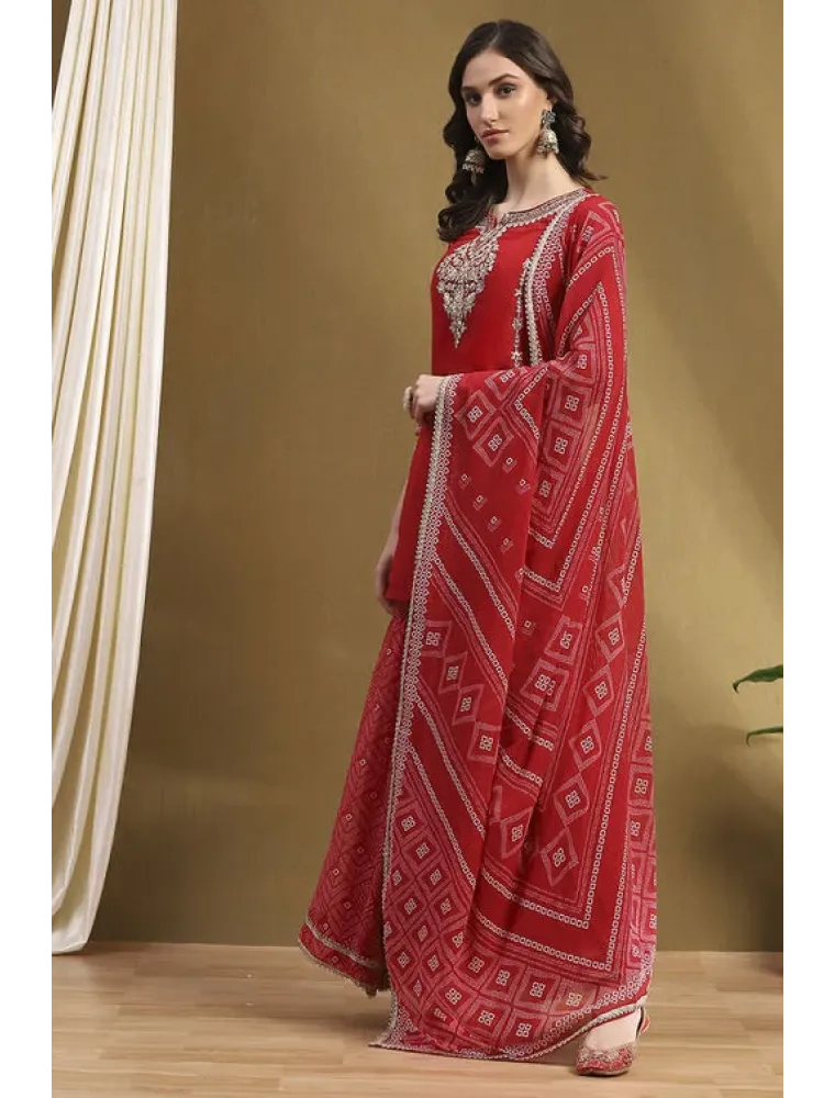 Exude timeless elegance with our red straight suit set, crafted from a luxurious polyester blend fabric for those who appreciate classic style with a modern twist. This three-piece ensemble is ideal for festive occasions, featuring a beautifully embroidered kurti, a printed garara, and a coordinating dupatta.
